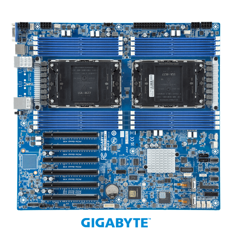 Das Intel-basierte System wird durch passende Hardware von GIGABYTE optimal ergänzt. Das MS73-HB1 Mainboard ist darauf ausgelegt, die volle Leistung dieser Plattform auszuschöpfen – mit Unterstützung für PCIe-Gen5-Beschleuniger, Gen5-NVMe-SSDs und DDR5-Arbeitsspeicher, wodurch hohe Datenraten, geringe Latenz und maximale Systemleistung ermöglicht werden.